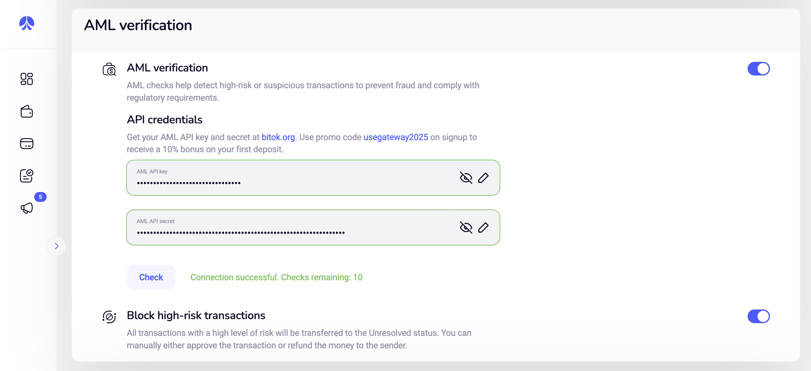 The AML verification settings in Gateway Settings (Account → Gateway) have been enhanced with improved messaging and credential validation.