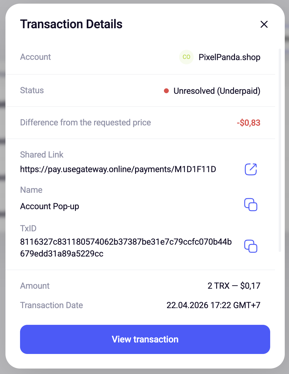 Transaction details now display the difference from the requested price when an underpayment occurs. The difference amount helps users quickly identify how much additional payment is required to complete the transaction.