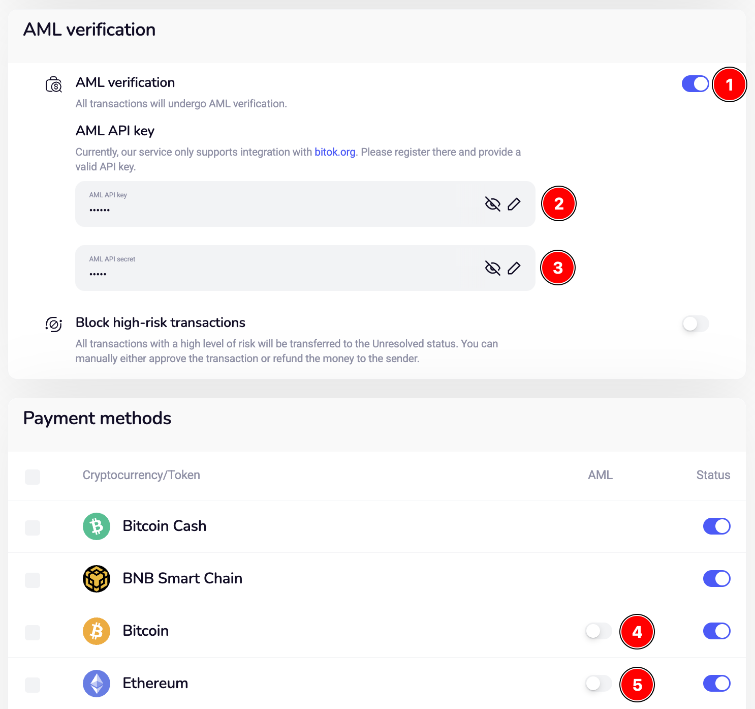 When AML verification is enabled and a valid API key is added, the option to enable AML checks for BTC and ETH becomes available, and all transactions in these currencies are automatically sent for AML risk assessment.