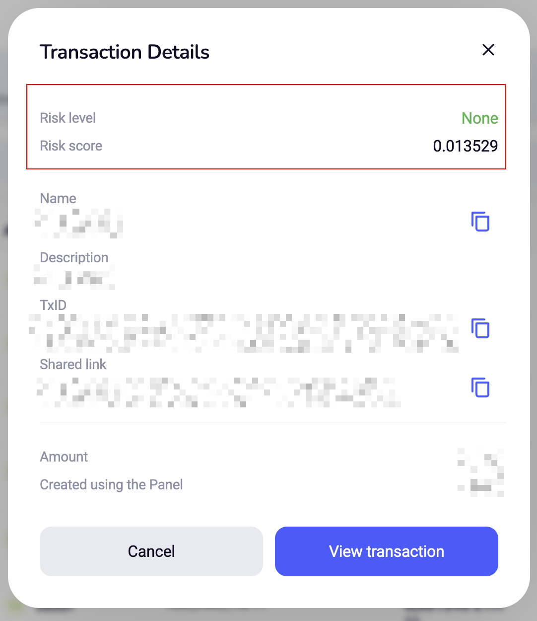 After verification, the transaction details display one of the following risk levels — none, low, medium, high, or severe — along with a risk score and a colored icon (green, yellow, or red) that reflects the risk severity.